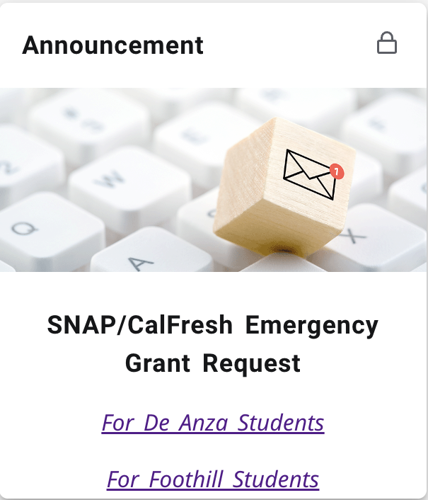 At both De Anza College and Foothill College, we are committed to supporting your basic needs and well-being during this difficult time. To help offset the loss of SNAP/CalFresh benefits, we have created a process for students to request emergency funds through MyPortal.
